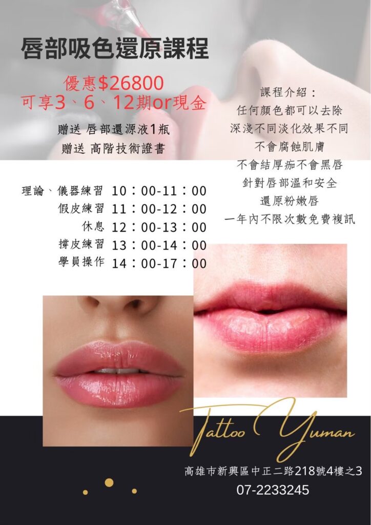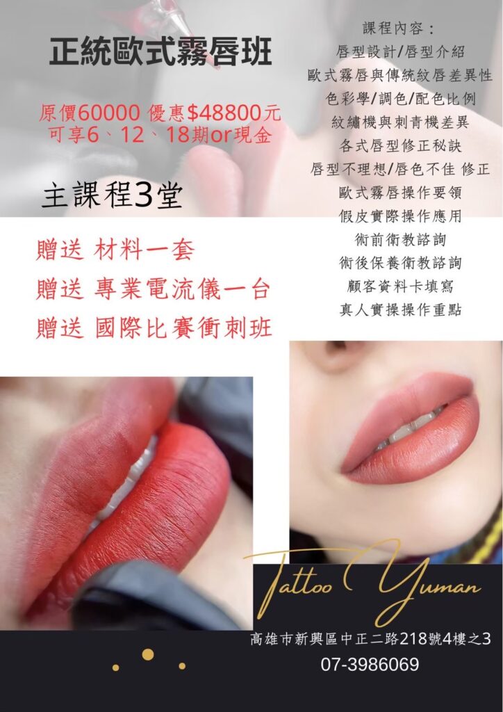 • 霧唇/轉色 完整技術教學 • 色乳調配、設計美感、操作安全與衛教 • 真人實操練習,從模擬到實戰一步到位 • 可協助輔導報考TSIA紋繡技術證照